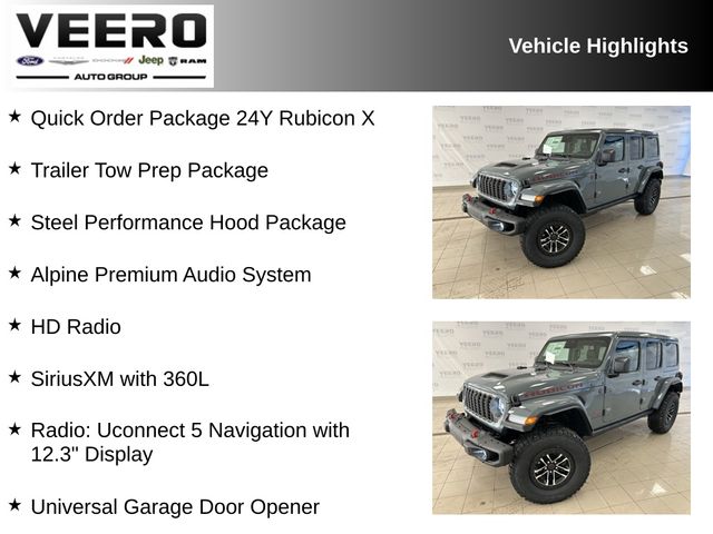 12.3" Touchscreen Display, 4G LTE Wi-Fi Hot Spot, Acoustic Front Seat Area Carpet, Acoustic Laminated Front Door Glass, Alpine Premium Audio System, Apple CarPlay/Android Auto, Auto High Beam Headlamp Control, Auto-Dimming Rear-View Mirror, Blind Spot and Cross Path Detection, Body Color Rubicon Highline Flare, Google Android Auto, HD Radio, Heated Front Seats, Heated Steering Wheel, Integrated Off-Road Camera, Integrated Voice Command with Bluetooth, Leather Wrapped Park Brake Handle, Leather Wrapped Shift Knob, MOPAR Hardtop Headliner, Nappa Leather Seats, ParkSense Rear Park Assist System, Performance Hood, Power Adjust 8-Way Driver Seat, Power Adjust 8-Way Front Passenger Seat, Power Top Quarter Window Storage Bag, Premium Door Trim Panel, Quick Order Package 24Y Rubicon X, Radio: Uconnect 5 Navigation with 12.3" Display, Removable Rear Quarter Windows, SiriusXM with 360L, Sky One-Touch Power Top, Steel Performance Hood Package, Trailer Tow Prep Package, Universal Garage Door Opener.