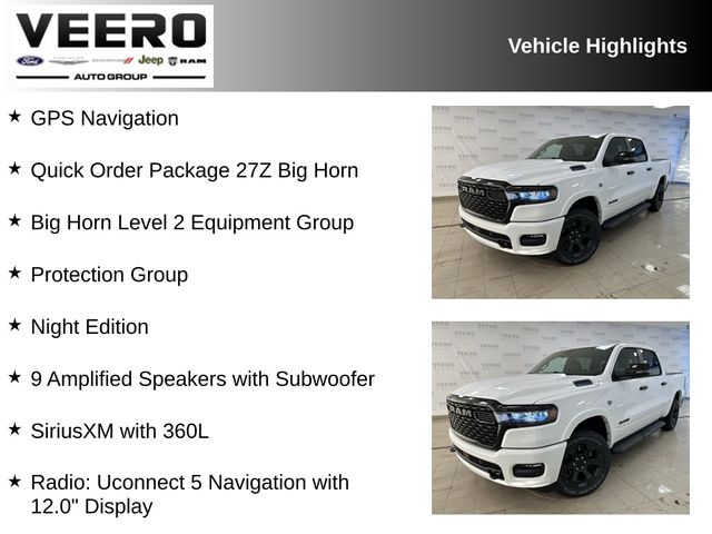 115V Auxiliary Rear Power Outlet, 12" Touchscreen Display, 400W Inverter, 9 Amplified Speakers with Subwoofer, Anti-Spin Differential Rear Axle, Apple CarPlay/Android Auto, Auto Power-Folding Mirrors, Auto-Dimming Exterior Driver Mirror, Auto-Dimming Rear-View Mirror, Big Horn Level 2 Equipment Group, Cluster 7.0" TFT Color Display, Convex Wide-Angle Exterior Mirror Insert, Dual Exhaust with Black Tips, GPS Navigation, Heated Front Seats, Heated Steering Wheel, Integrated Voice Command with Bluetooth, Leather Wrapped Steering Wheel, LED Dome Lamp with on/Off Switch, LED Footwell Lighting, Media Hub with 2 Charge Only USBs, Night Edition, Power Adjustable Pedals, Protection Group, Quick Order Package 27Z Big Horn, Radio: Uconnect 5 Navigation with 12.0" Display, Rear Power Sliding Window, Remote Tailgate Release, SiriusXM with 360L, Tow Hooks, Trailer Brake Control, Wheels: 20" x 9.0" Aluminum Painted Clad.