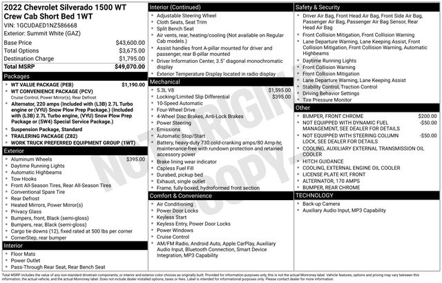 Veero Ford & CDJR of Morris is proud to offer this reliable 2022 Chevrolet Silverado 1500 WT in Summit White, beautifully equipped with Preferred Equipment Group 1WT (3.5" Monochromatic Display Driver Info Center, Black (Semi-Gloss) Front Bumper, Black (Semi-Gloss) Rear Bumper, Black Manual Outside Mirrors, Bluetooth® For Phone, Electrical Steering Column Lock, Front Frame-Mounted Black Recovery Hooks, HD Rear Vision Camera, Inside Rear-View Mirror w/Tilt, Locking Tailgate, Manual Tailgate Function w/No EZ Lift, Manual Tilt Wheel Steering Column, Power Front Windows w/Driver Express Up/Down, Power Front Windows w/Passenger Express Down, Power Rear Windows w/Express Down, Rear 60/40 Folding Bench Seat (Folds Up), Remote Keyless Entry, Rubberized-Vinyl Floor Covering, Solar Absorbing Tinted Glass, and Standard Tailgate), Standard Suspension Package, Trailering Package (Hitch Guidance), WT Convenience Package (Deep-Tinted Glass, Electric Rear-Window Defogger, Electronic Cruise Control, and Heated Power-Adjustable Outside Mirrors), WT Convenience Package w/DPO, WT Value Package, 10-Speed Automatic, 4WD, Black Cloth, 170 Amp Alternator, 220 Amp Alternator, 4-Wheel Disc Brakes, 40/20/40 Front Split-Bench Seat, 6 Speakers, 6-Speaker Audio System, ABS brakes, Air Conditioning, AM/FM radio, Apple CarPlay/Android Auto, Auto High-beam Headlights, Auto-Locking Rear Differential, Automatic Emergency Braking, Auxiliary External Transmission Oil Cooler, Brake assist, Delay-off headlights, Driver door bin, Dual front impact airbags, Dual front side impact airbags, Electronic Stability Control, External Engine Oil Cooler, Following Distance Indicator, Forward Collision Alert, Front anti-roll bar, Front Center Armrest w/Storage, Front Chrome Bumper, Front License Plate Kit, Front Pedestrian Braking, Front reading lights, Front wheel independent suspension, Fully automatic headlights, Illuminated entry, IntelliBeam Automatic High Beam On/Off, Lane Keep Assist w/Lane Departure Warning, Low tire pressure warning, Not Equipped w/Dynamic Fuel Management, Not Equipped w/Steering Column Lock, Occupant sensing airbag, Outside temperature display, Overhead airbag, Overhead console, Panic alarm, Passenger door bin, Passenger vanity mirror, Power steering, Power windows, Premium audio system: Chevrolet Infotainment 3, Radio data system, Radio: Chevrolet Infotainment 3 System, Rear Chrome Bumper, Rear reading lights, Rear step bumper, Remote Keyless Entry, Speed-sensing steering, Split folding rear seat, Tachometer, Tilt steering wheel, Traction control, Trip computer, Variably intermittent wipers, Vinyl Seat Trim, Voltmeter, Wheels: 17" x 8" Bright Silver Painted Aluminum, and Wheels: 17" x 8" Ultra Silver Painted Steel. Sales Tax, Title, License Fee, Registration Fee, $350 Dealer Documentary Fee, Finance Charges and Emission Testing Fees (if applicable) are additional to the advertised price. Check out the rest of the features on this vehicle. Preferred Equipment Group 1WT (3.5" Monochromatic Display Driver Info Center, Black (Semi-Gloss) Front Bumper, Black (Semi-Gloss) Rear Bumper, Black Manual Outside Mirrors, Bluetooth® For Phone, Electrical Steering Column Lock, Front Frame-Mounted Black Recovery Hooks, HD Rear Vision Camera, Inside Rear-View Mirror w/Tilt, Locking Tailgate, Manual Tailgate Function w/No EZ Lift, Manual Tilt Wheel Steering Column, Power Front Windows w/Driver Express Up/Down, Power Front Windows w/Passenger Express Down, Power Rear Windows w/Express Down, Rear 60/40 Folding Bench Seat (Folds Up), Remote Keyless Entry, Rubberized-Vinyl Floor Covering, Solar Absorbing Tinted Glass, and Standard Tailgate), Standard Suspension Package, Trailering Package (Hitch Guidance), WT Convenience Package (Deep-Tinted Glass, Electric Rear-Window Defogger, Electronic Cruise Control, and Heated Power-Adjustable Outside Mirrors), WT Convenience Package w/DPO, WT Value Package, 10