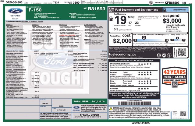 Veero Ford & CDJR of Morris is pleased to offer this dependable 2019 Ford F-150 Lariat in Ruby Red Metallic, beautifully equipped with Equipment Group 502A Luxury, FX4 Off-Road Package, GVWR: 7,050 lbs Payload Package, Lariat Chrome Appearance Package (Chrome 2-Bar Grille w/4 Minor Bars, Chrome Angular Step Bars, Chrome Door & Tailgate Handles w/Body-Color Bezel, Chrome Skull Caps on Exterior Mirrors, Single-Tip Chrome Exhaust, and Wheels: 18" Chrome-Like PVD), Max Trailer Tow Package (Class IV Trailer Hitch Receiver, Engine Oil Cooler, Extended Range 36 Gallon Fuel Tank, Integrated Trailer Brake Controller, Pro Trailer Backup Assist, and Upgraded Front Stabilizer Bar), 4WD, 18" Machined-Aluminum Wheels, 4-Wheel Disc Brakes, 7 Speakers, ABS brakes, Adjustable pedals, Air Conditioning, Alloy wheels, AM/FM radio: SiriusXM, AppLink/Apple CarPlay and Android Auto, Auto High-beam Headlights, Auto-dimming door mirrors, Auto-dimming Rear-View mirror, Automatic temperature control, Brake assist, Bumpers: chrome, Compass, Cooled Seats, Delay-off headlights, Driver door bin, Driver vanity mirror, Dual front impact airbags, Dual front side impact airbags, Electronic Stability Control, Emergency communication system: SYNC 3 911 Assist, Engine Block Heater, Exterior Parking Camera Rear, Front anti-roll bar, Front Center Armrest w/Storage, Front dual zone A/C, Front fog lights, Front License Plate Bracket, Front reading lights, Front wheel independent suspension, Fully automatic headlights, Heated door mirrors, Heated front seats, Illuminated entry, Leather-Trimmed 40/20/40 Front Seat, Low tire pressure warning, Memory seat, Occupant sensing airbag, Outside temperature display, Overhead airbag, Overhead console, Panic alarm, Passenger door bin, Passenger vanity mirror, Pedal memory, Power door mirrors, Power driver seat, Power passenger seat, Power steering, Power windows, Radio data system, Radio: AM/FM Stereo w/6 Speakers, Rear reading lights, Rear seat center armrest, Rear step bumper, Rear window defroster, Remote Keyless Entry, Security system, SiriusXM Radio, Speed control, Speed-sensing steering, Split folding rear seat, Steering wheel mounted audio controls, SYNC 3, Tachometer, Tailgate Step w/Tailgate Lift Assist, Telescoping steering wheel, Tilt steering wheel, Traction control, Trip computer, Turn signal indicator mirrors, Variably intermittent wipers, Voice-Activated Touchscreen Navigation, and Voltmeter. Sales Tax, Title, License Fee, Registration Fee, $350 Dealer Documentary Fee, Finance Charges and Emission Testing Fees (if applicable) are additional to the advertised price. Check out the rest of the features on this vehicle. Equipment Group 502A Luxury, FX4 Off-Road Package, GVWR: 7,050 lbs Payload Package, Lariat Chrome Appearance Package (Chrome 2-Bar Grille w/4 Minor Bars, Chrome Angular Step Bars, Chrome Door & Tailgate Handles w/Body-Color Bezel, Chrome Skull Caps on Exterior Mirrors, Single-Tip Chrome Exhaust, and Wheels: 18" Chrome-Like PVD), Max Trailer Tow Package (Class IV Trailer Hitch Receiver, Engine Oil Cooler, Extended Range 36 Gallon Fuel Tank, Integrated Trailer Brake Controller, Pro Trailer Backup Assist, and Upgraded Front Stabilizer Bar), 4WD, 18" Machined-Aluminum Wheels, 4-Wheel Disc Brakes, 7 Speakers, ABS brakes, Adjustable pedals, Air Conditioning, Alloy wheels, AM/FM radio: SiriusXM, AppLink/Apple CarPlay and Android Auto, Auto High-beam Headlights, Auto-dimming door mirrors, Auto-dimming Rear-View mirror, Automatic temperature control, Brake assist, Bumpers: chrome, Compass, Cooled Seats, Delay-off headlights, Driver door bin, Driver vanity mirror, Dual front impact airbags, Dual front side impact airbags, Electronic Stability Control, Emergency communication system: SYNC 3 911 Assist, Engine Block Heater, Exterior Parking Camera Rear, Front anti-roll bar, Front Center Armrest w/Storage, Front dual zone A/C, Front fog lights,