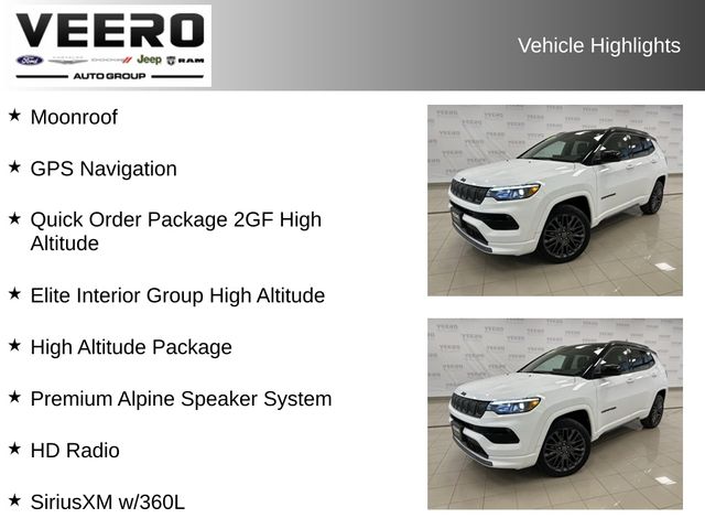 For enhanced safety and driver assistance, the Compass High Altitude is equipped with a suite of advanced technologies, including a ParkView rear backup camera, blind spot monitoring, and automatic high-beam headlights. Whether you're navigating city streets or exploring the great outdoors, this Jeep Compass is ready to take you there in style and comfort.